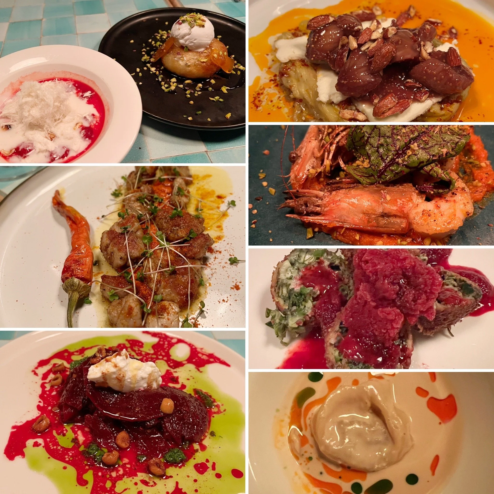 A smattering of the courses at Yeni Lokanta, including—starting in the upper right and moving clockwise— eggplant with goat cheese, figs, and nuts; prawns with carrot puree and chard; herb fritters with a sour cherry sorbet; a beef dumpling with a savory yogurt sauce; braised beets with dried sour cherries, hazelnuts, and Turkish feta; lamb sausage; and a dessert course with a tonka bean-flavored rice pudding with raspberries and sugar floss, and a katmer phyllo pastry with coconut ice cream.